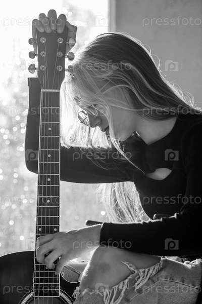 Обучение игре на гитаре. Музыка. Талантливая девочка-музыкант сидит одна и играет песни на гитаре. Девочка играет спокойную мелодию на музыкальном инструменте