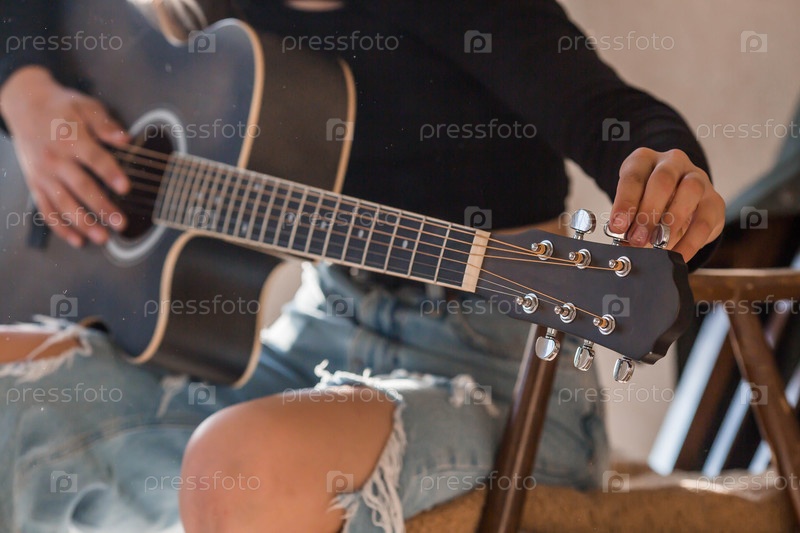 Обучение игре на гитаре. Музыка. Талантливая девочка-музыкант сидит одна и играет песни на гитаре. Девочка играет спокойную мелодию на музыкальном инструменте