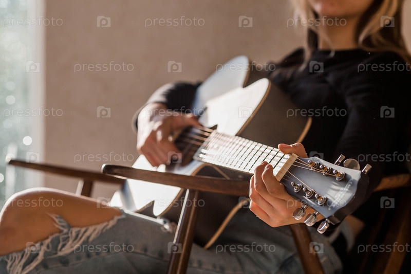 Обучение игре на гитаре. Музыка. Талантливая девочка-музыкант сидит одна и играет песни на гитаре. Девочка играет спокойную мелодию на музыкальном инструменте
