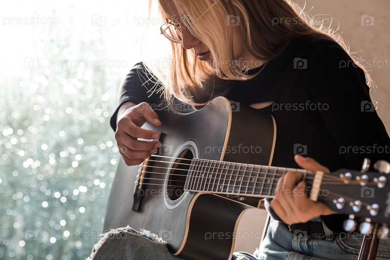Обучение игре на гитаре. Музыка. Талантливая девочка-музыкант сидит одна и играет песни на гитаре. Девочка играет спокойную мелодию на музыкальном инструменте