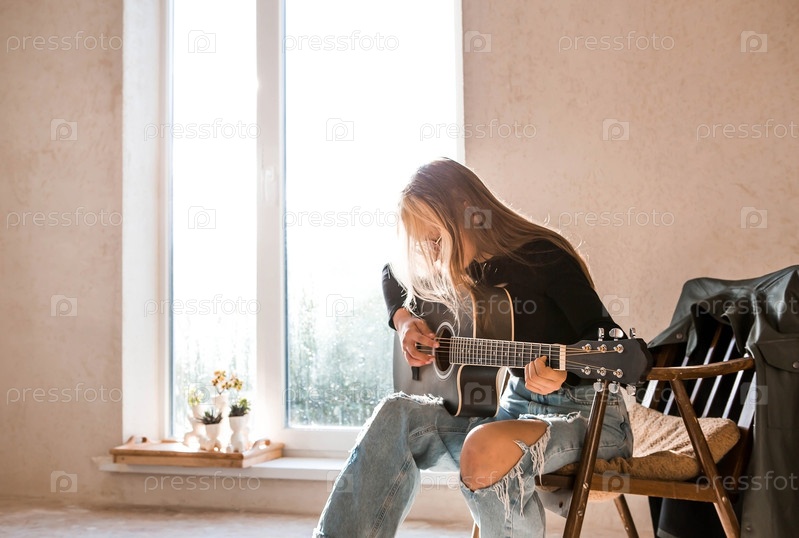 Обучение игре на гитаре. Музыка. Талантливая девочка-музыкант сидит одна и играет песни на гитаре. Девочка играет спокойную мелодию на музыкальном инструменте