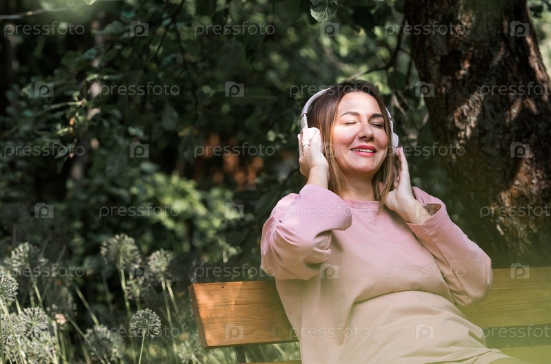 Красивая 35-летняя женщина слушает музыку в больших наушниках. Крупный план. Гармония, расслабление и релакс