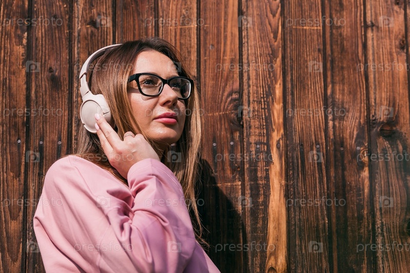 Красивая 35-летняя женщина слушает музыку в больших наушниках. Крупный план. Гармония, расслабление и релакс