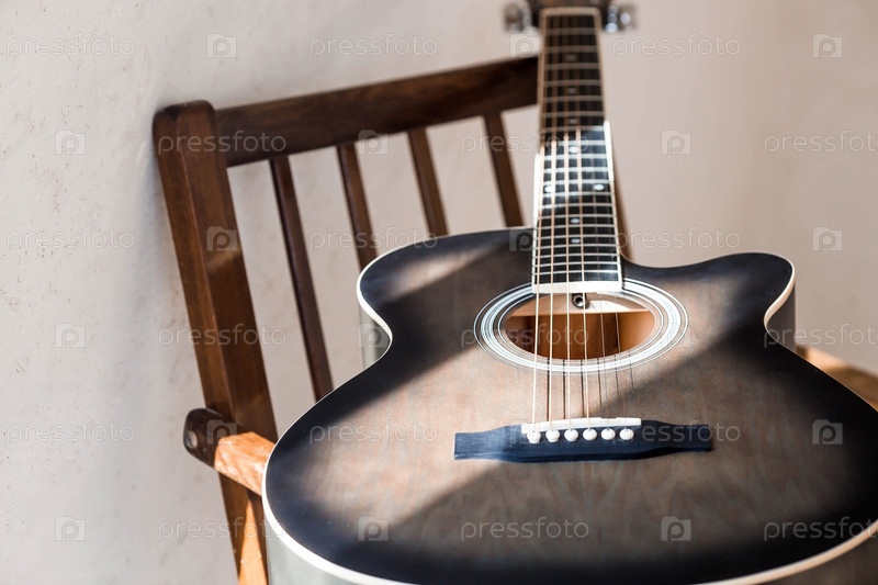 Гитара. Гитарные аккорды. Акустическая гитара. Музыка. Музыкальный фон. Изображение акустической гитары в комнате с ретро-креслом. Жесткий свет. Тени
