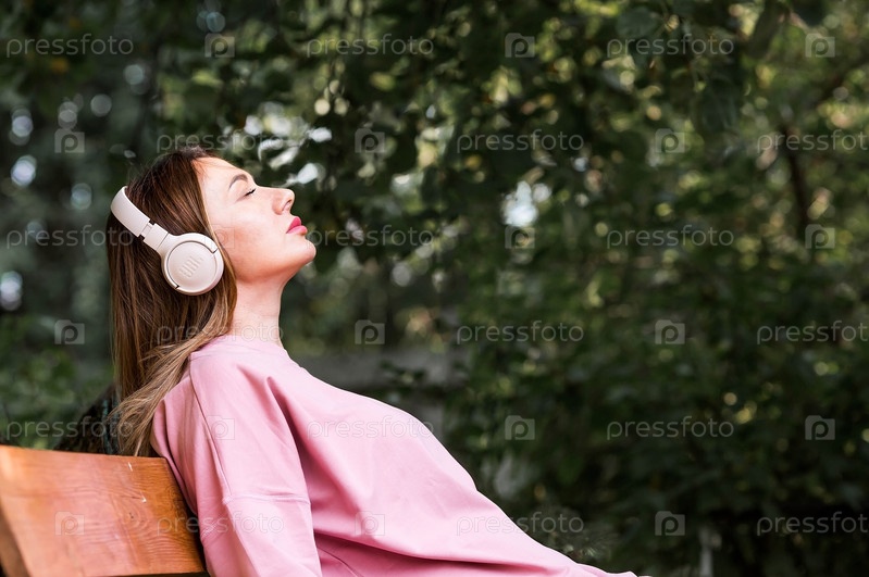 Красивая 35-летняя женщина слушает музыку в больших наушниках. Крупный план. Гармония, расслабление и релакс