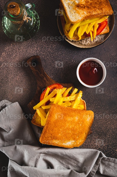 Хрустящий сэндвич с картофелем фри и помидорами на доске на столешнице и вертикальный вид