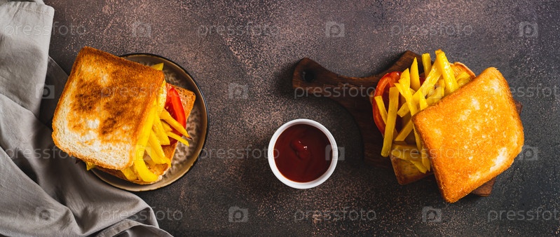 Хрустящий сэндвич с картофелем фри и помидорами на доске на столешнице веб-баннер