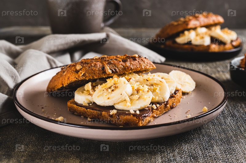Сладкий сэндвич с шоколадным маслом, бананом и орехами на тарелке на столе
