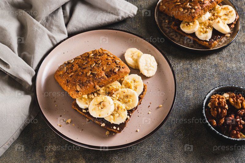 Тост из ржаного хлеба с шоколадом и бананом на тарелке на столе