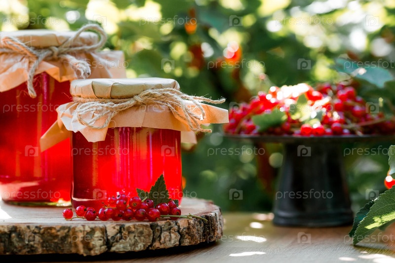 Консервация и летний урожай. Домашнее полезное желе, варенье из красной смородины на фоне куста смородины. Подготовка банок. Сладости