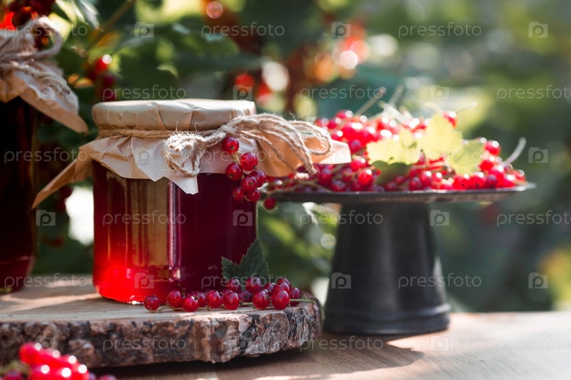Консервация и летний урожай. Домашнее полезное желе, варенье из красной смородины на фоне куста смородины. Подготовка банок. Сладости
