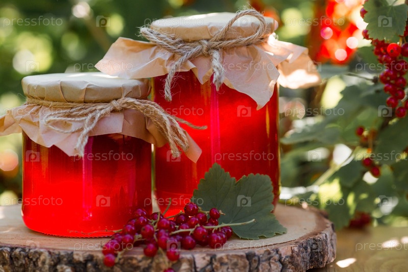 Консервация и летний урожай. Домашнее полезное желе, варенье из красной смородины на фоне куста смородины. Подготовка банок. Сладости