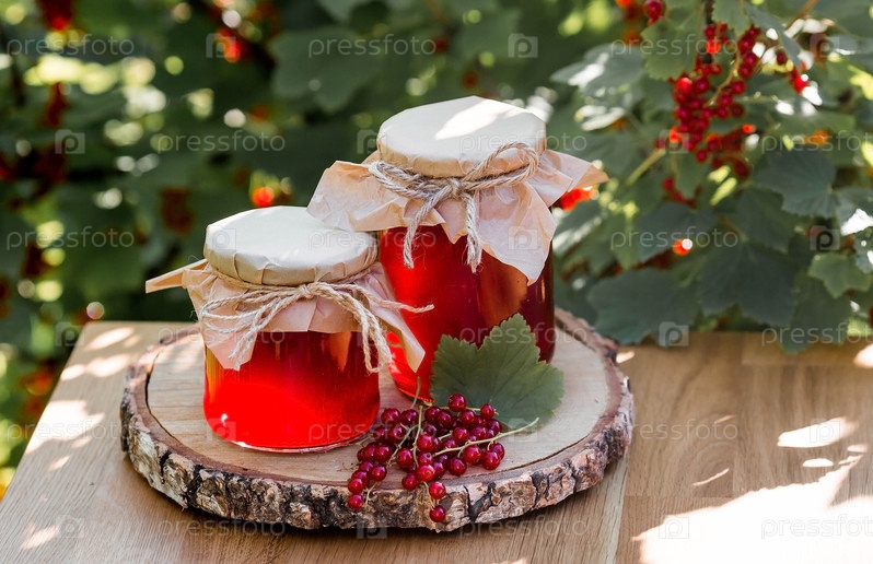 Консервация и летний урожай. Домашнее полезное желе, варенье из красной смородины на фоне куста смородины. Подготовка банок. Сладости