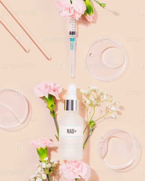 Флакончик для ухода за кожей NAD со шприцем, лабораторными инструментами и нежными цветами