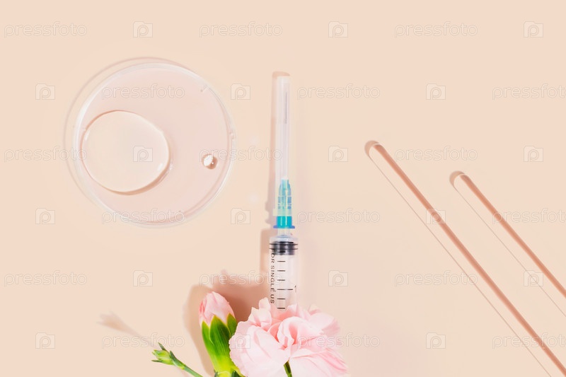 Шприц с розовыми цветами, лабораторные инструменты и чашка Петри на фоне ню