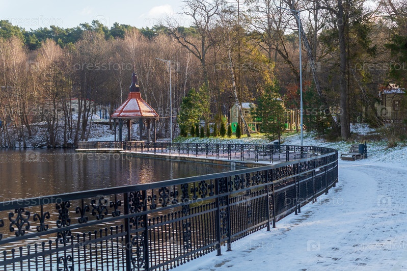 Светлогорск, Калининград, Россия - 2023, 05 февраля: Прогулочная дорожка в парке зимой. Прогулочная дорожка в парке Муза вокруг озера Тихо