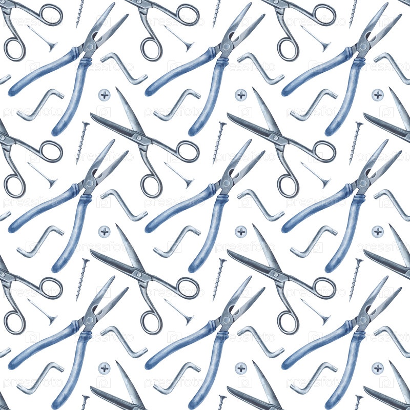 Акварельный бесшовный узор с мужскими инструментами нарисован вручную. Железные ножницы, плоскогубцы, гвозди и шурупы на белом фоне. Ремонт дома, обслуживание