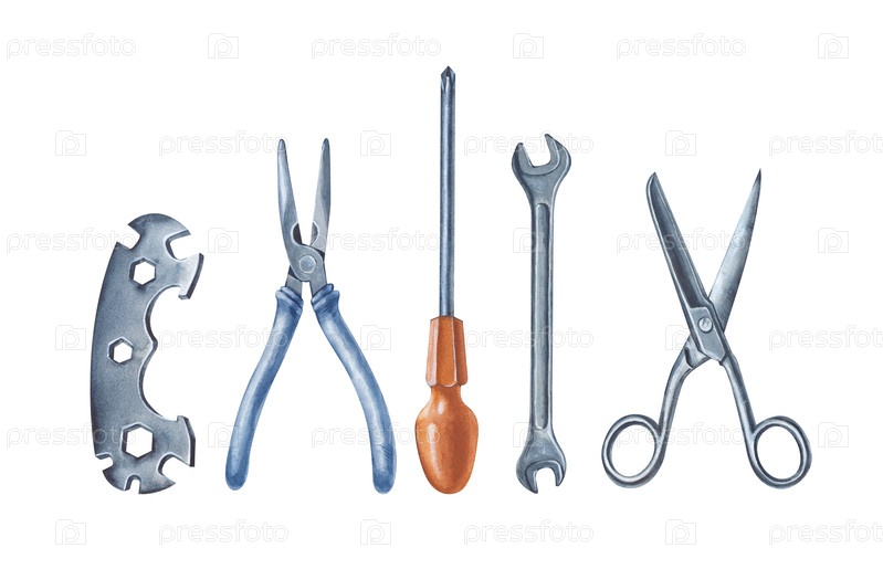Акварельные рабочие инструменты, изолированные на белом фоне. Гаечный ключ, ножницы, плоскогубцы, велосипедный ключ и отвертка. Акварельная иллюстрация. Техническое обслуживание и ремонт дома