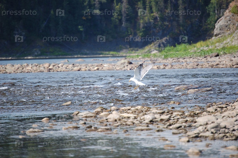 Чайка на реке охотится