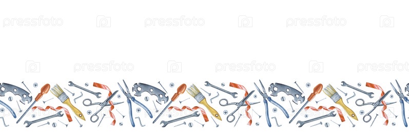Акварель бесшовный бордюр с различными инструментами для ремонта. Иллюстрация мужских инструментов. Плоскогубцы, щетка, гвозди, винты, отвертка, ножницы. Изображение для дизайна в сфере строительства и ремонта