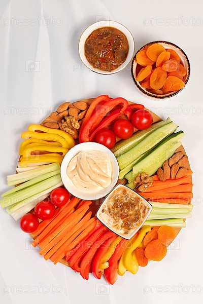 Блюдо хумуса с закусками, фон кухни здорового питания с миской хумуса и сырыми овощными палочками, орехами и курагой. Блюдо Ближнего Востока, традиционные веганские закуски, восточная кухня