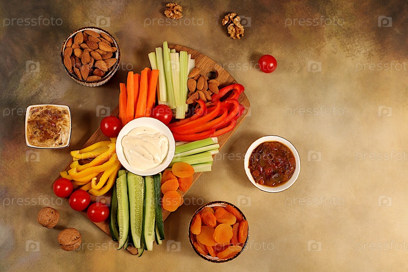 Ближневосточная тарелка, фон здоровой кухни с миской хумуса и сырыми овощными палочками, орехами и курагой. Тарелка хумуса с закусками, традиционные веганские закуски, восточная кухня