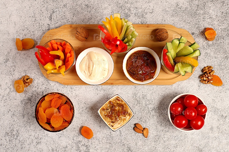 Восточная кухня и концепция здоровой закуски, Здоровая кухня с миской хумуса и сырыми овощными палочками, орехами и курагой. Блюдо хумуса с закусками, веганские закуски,