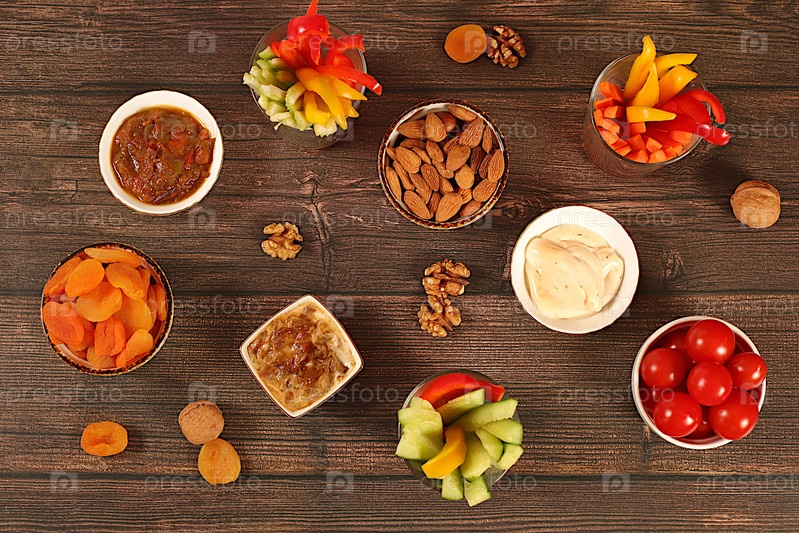 Восточная кухня и концепция здоровой закуски, Здоровая кухня с миской хумуса и сырыми овощными палочками, орехами и курагой. Блюдо хумуса с закусками, веганские закуски,