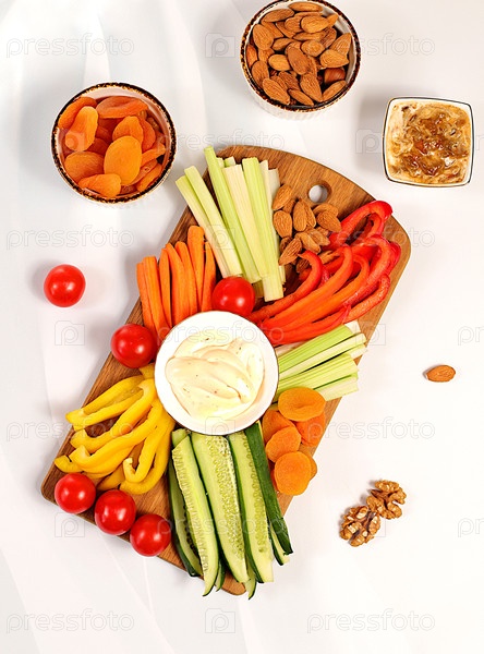 Блюдо хумуса с закусками, фон кухни здорового питания с миской хумуса и сырыми овощными палочками, орехами и курагой. Блюдо Ближнего Востока, традиционные веганские закуски, восточная кухня