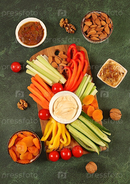 Здоровая еда кухня фон с миской хумуса и сырыми овощными палочками, орехами и курагой. Хумус тарелка с закусками, ближневосточная тарелка, традиционные веганские закуски, восточная кухня