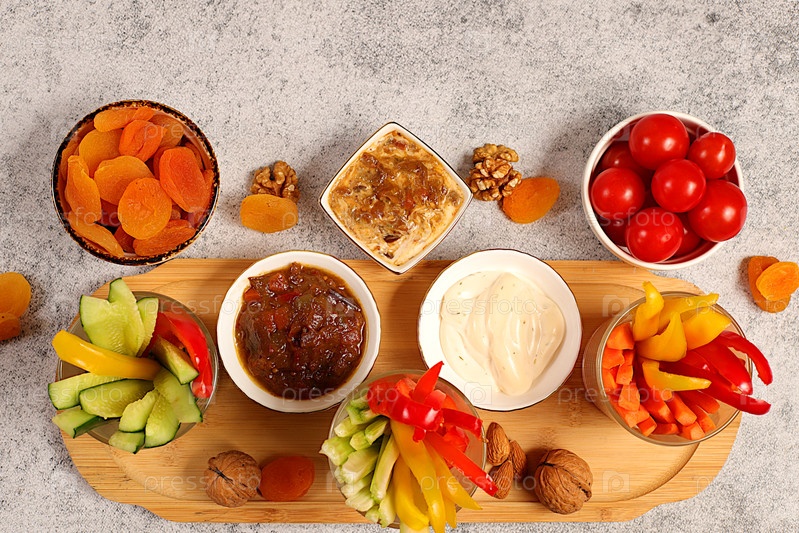 Ближневосточная тарелка, фон здоровой кухни с миской хумуса и сырыми овощными палочками, орехами и курагой. Тарелка хумуса с закусками, традиционные веганские закуски, восточная кухня