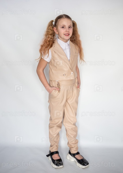Портрет. Девочка модель в модном кожаном костюме. 2025 год. Portrait. The girl is a model in a fashionable leather suit. 2025