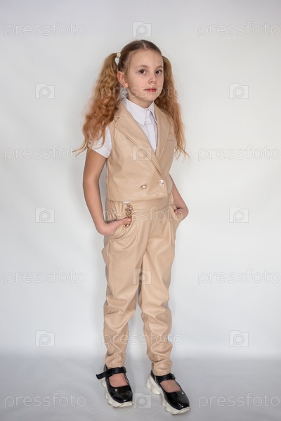 Портрет. Девочка модель в модном кожаном костюме. 2025 год. Portrait. The girl is a model in a fashionable leather suit. 2025