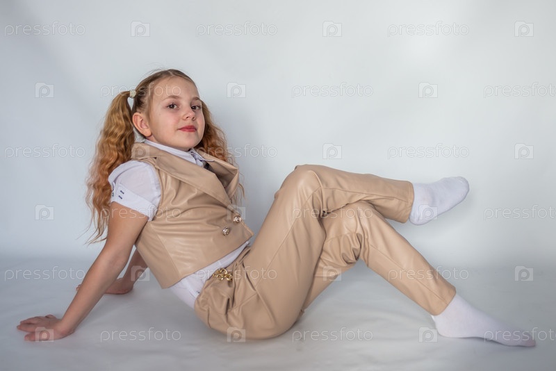 Портрет. Девочка модель в модном кожаном костюме. 2025 год. Portrait. The girl is a model in a fashionable leather suit. 2025