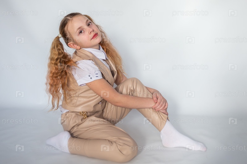 Портрет. Девочка модель в модном кожаном костюме. 2025 год. Portrait. The girl is a model in a fashionable leather suit. 2025