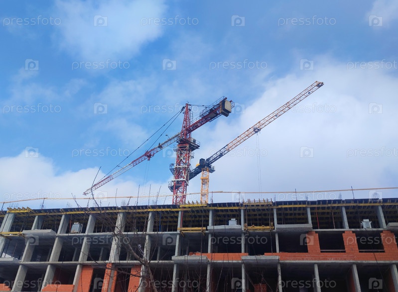 Строительный кран на стройке поднимает груз на строительную площадку многоэтажного дома на фоне голубого неба. A construction crane at a construction site lifts cargo onto the construction site of a multi-storey building against a blue sky background