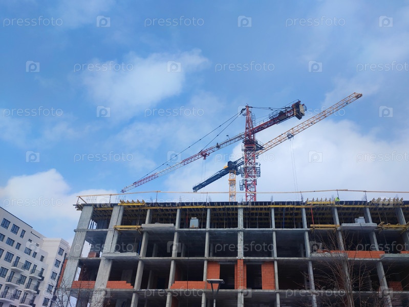 Строительный кран на стройке поднимает груз на строительную площадку многоэтажного дома на фоне голубого неба. A construction crane at a construction site lifts cargo onto the construction site of a multi-storey building against a blue sky background