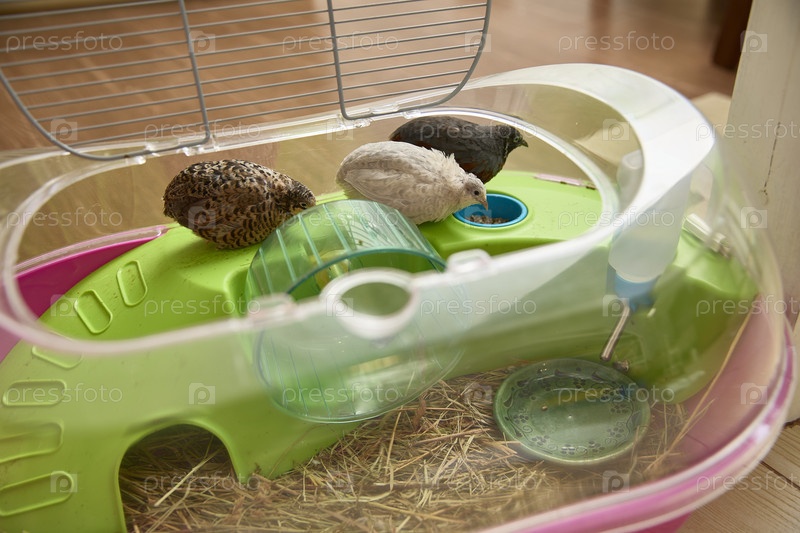 Две перепелки внутри красочной пластиковой клетки исследуют свое окружение. Одна перепелка активно ест из миски, а другая сидит на трубке