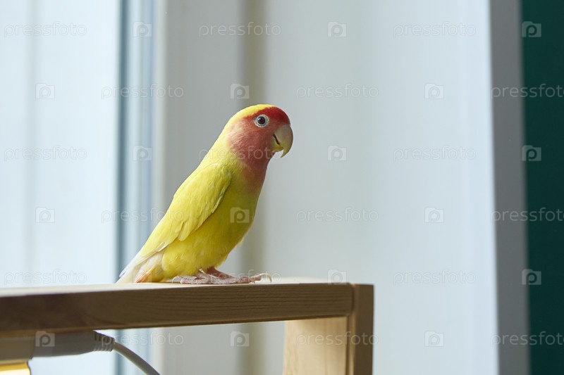 Красочный неразлучник с ярко-желтым и красным оперением сидит на деревянной полке у окна. Птица демонстрирует спокойное поведение, добавляя частичку природы в помещение