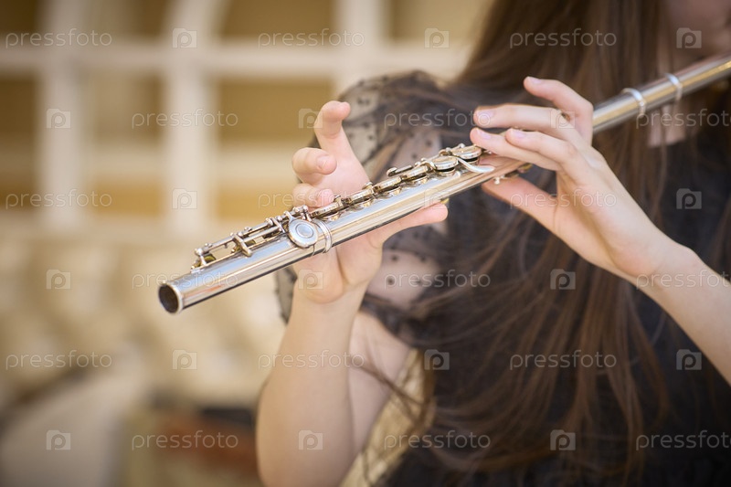 Руки деликатно играют на флейте, демонстрируя музыкальность и элегантную технику крупным планом. Пальцы расположены точно на инструменте, подчеркивая искусство игры на флейте