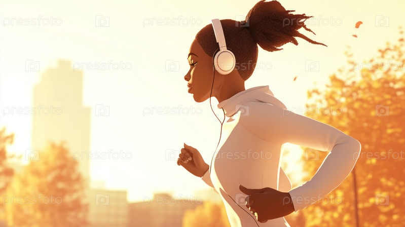 Пышнотелая африканская женщина бежит по городскому парку прохладным осенним утром, надев наушники. Сгенерированное изображение
