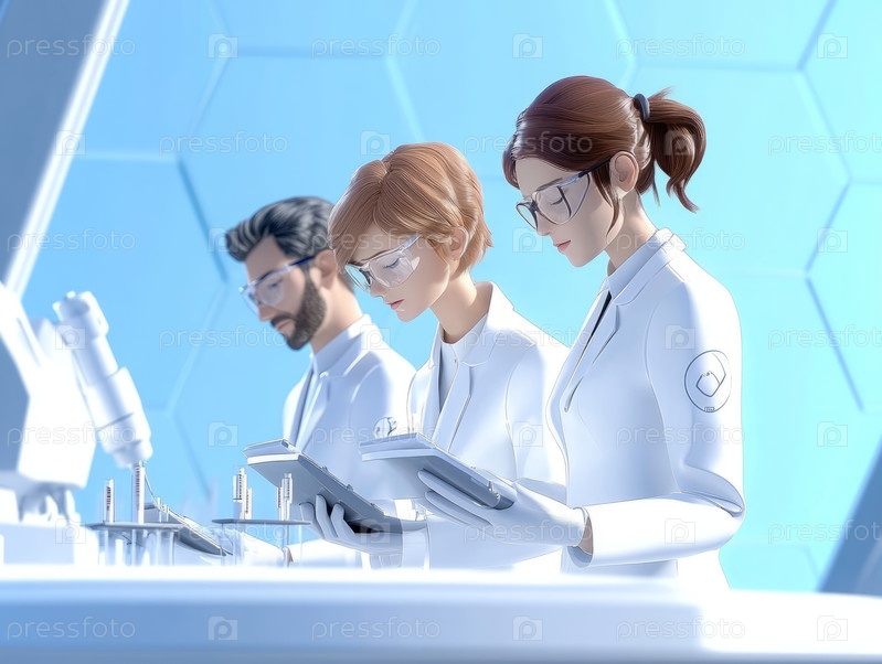 Разнообразная команда мужчин и женщин-ученых-медиков, работающих над новыми фармацевтическими продуктами в современной лаборатории. Сгенерированное изображение