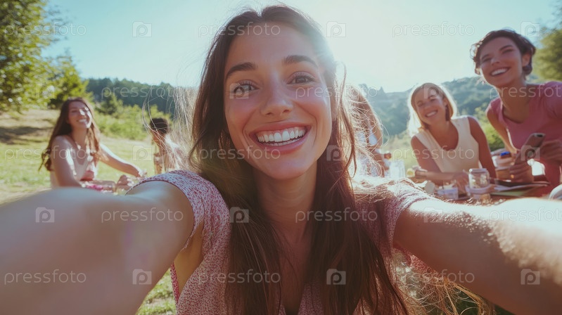 Счастливая женщина делает селфи с друзьями во время пикника на природе. Сгенерированное изображение