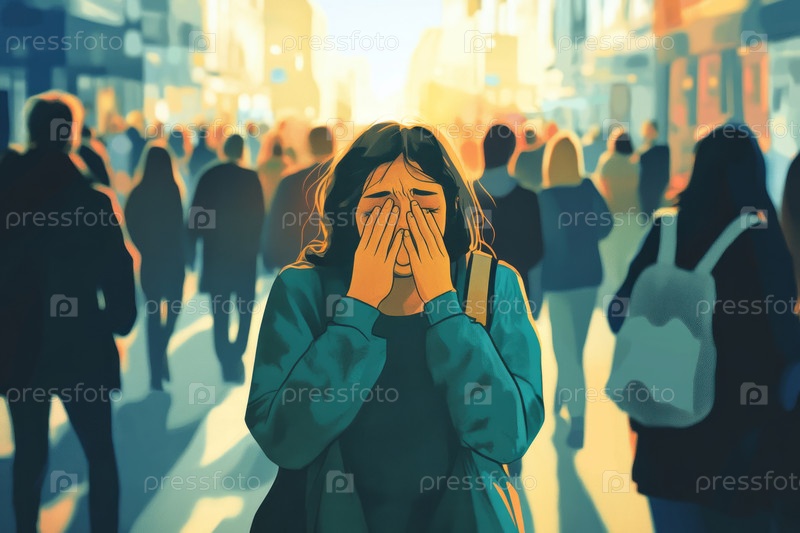 Женщина, испытывающая паническую атаку на оживленной городской улице, окруженная толпой, но при этом чувствующая себя изолированной и подавленной. Сгенерированное изображение