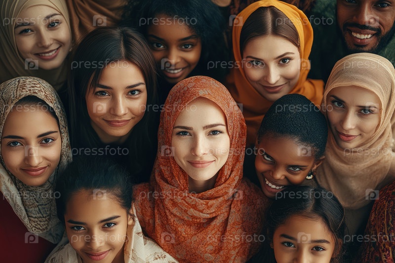 Группа людей разных рас, возрастов и убеждений, улыбающихся вместе в камеру. Сгенерированное изображение