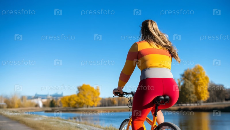 Уверенная в себе женщина размера «плюс» наслаждается поездкой на велосипеде свежим осенним утром. Сгенерированное изображение