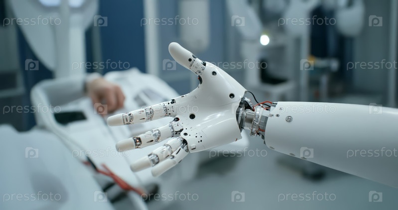 Инженер-робототехник калибрует роботизированный протез руки, демонстрируя передовые медицинские технологии. Сгенерированное изображение