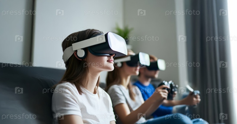Группа людей играет в видеоигры с гарнитурами виртуальной реальности во время тимбилдинга. Сгенерированное изображение
