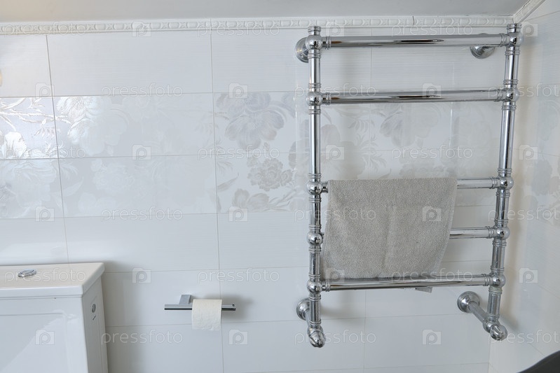Полотенце висит в современной ванной комнате с полотенцесушителем