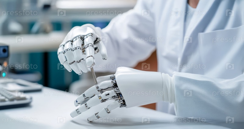 Инженер-робототехник калибрует роботизированный протез руки, демонстрируя передовые медицинские технологии. Сгенерированное изображение